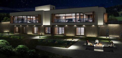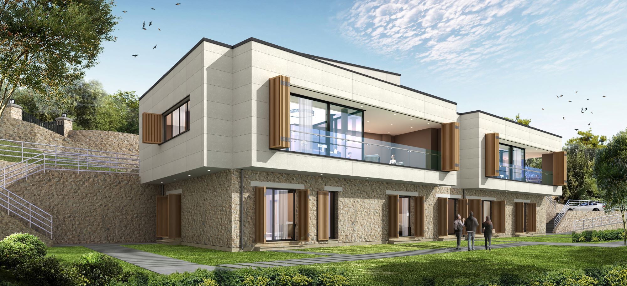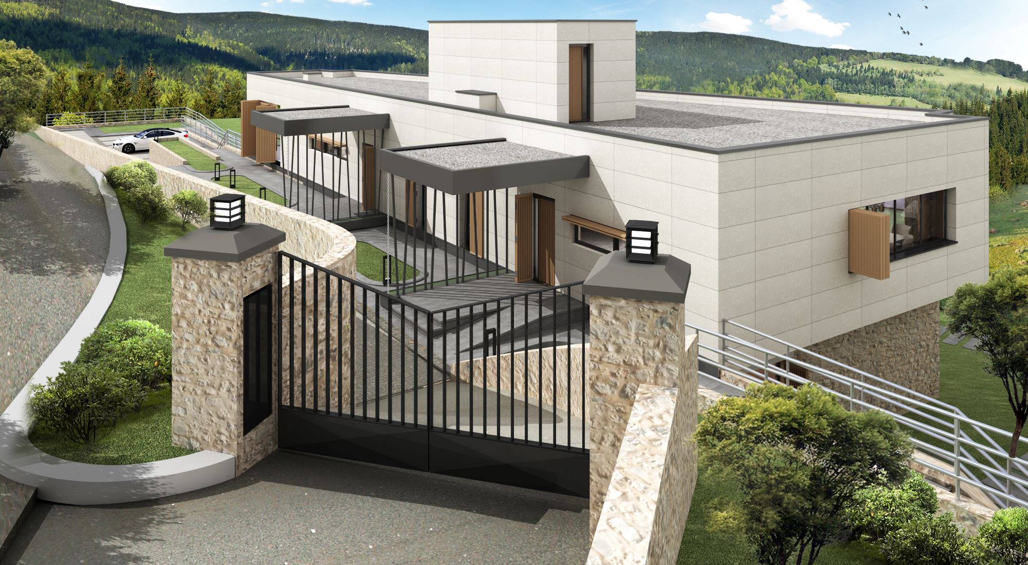 Since it is assumed that the house will be used on weekends and holidays and sometimes will not be used for a long time, protection shutters are designed on the facades. These shutters have large surfaces and can be opened and closed with a servo motor. Shutters completely cover the windows, ensuring the protection and security of the house from external impacts.