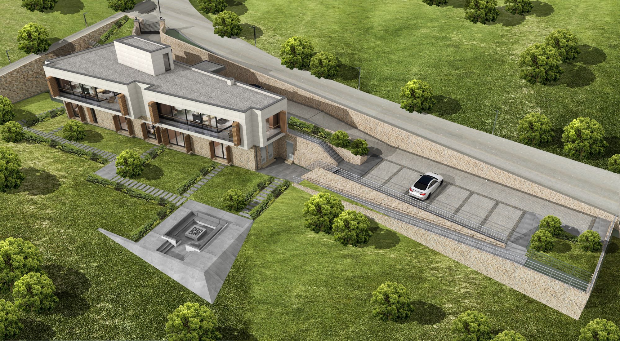 The residential area is entered by vehicle from the southeast corner of the land.   The ground floor level is 3 m below the road. The inclined road passes in front of the doors of two dwellings and reaches the parking lot in the west. Two stairs on the east and west connect the garden area at the ground floor level to the garden area at the basement floor. There is also a ramp for disabled people in the west.