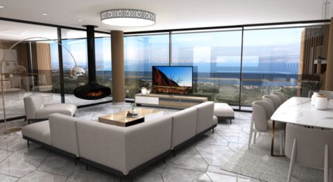 The ground floor consists of three main parts. Kitchen, indoor living area and outdoor living area. The focal point of these places is the bay view. Depending on the direction of the wind, the open living area is protected from the wind through the barrier provided by the closed living area. Wide sliding windows are designed to create closed and open spaces and not obstruct the view.