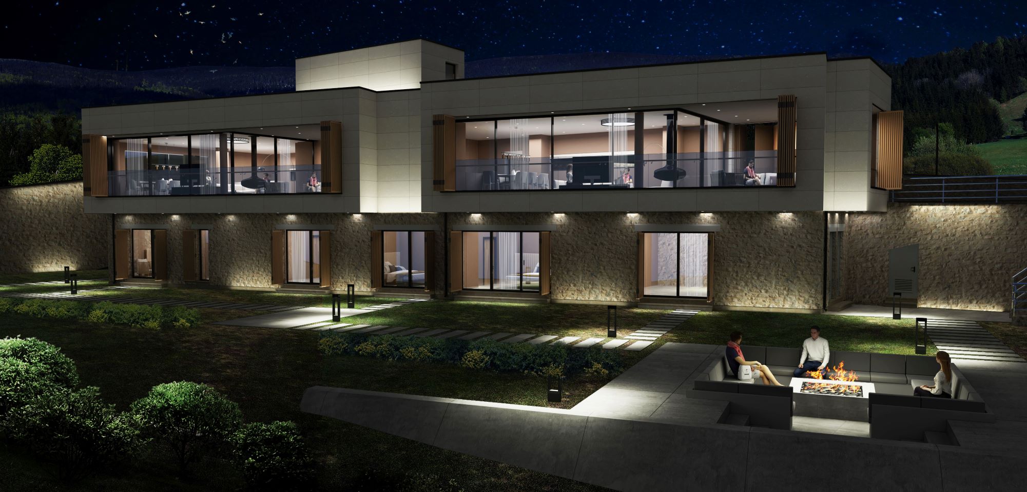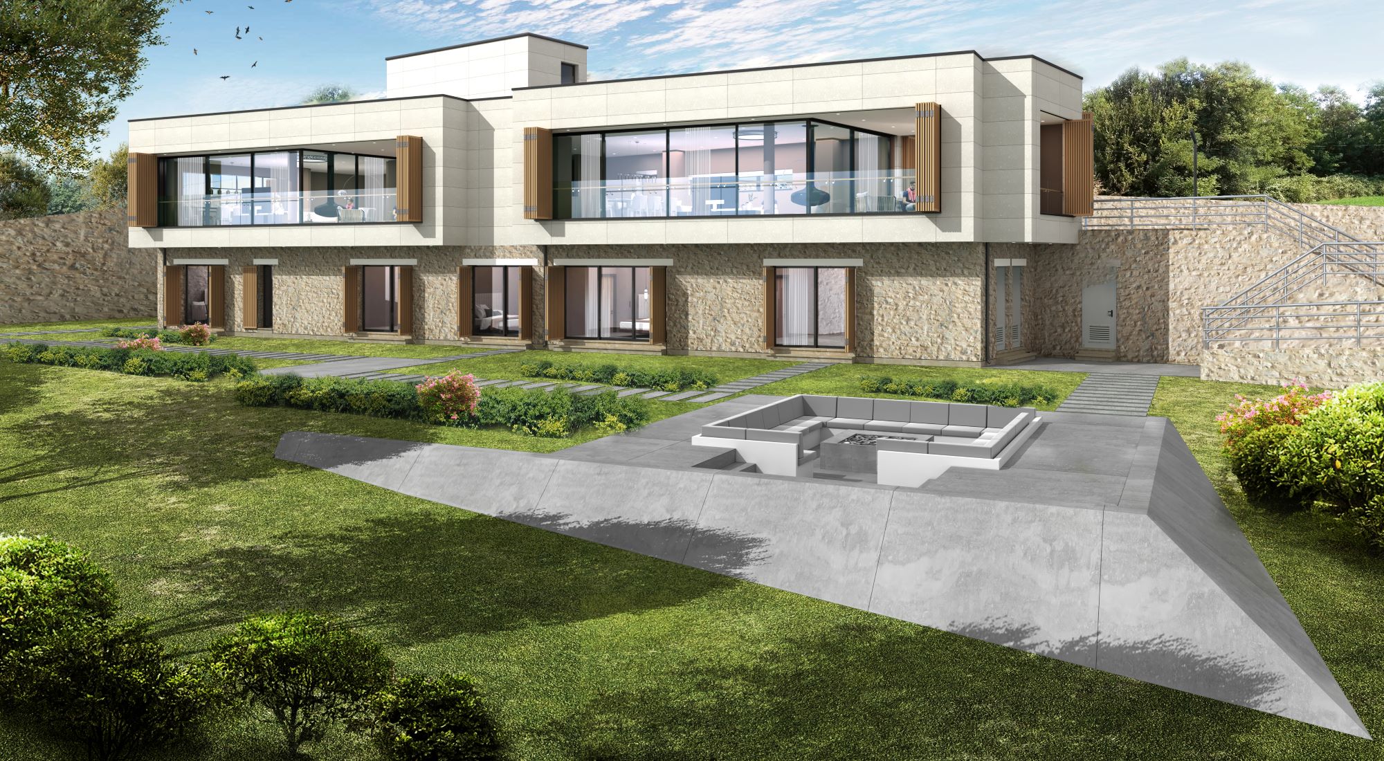 An open-air fireplace and seating group were designed in the north-west of the building, overlooking the view.