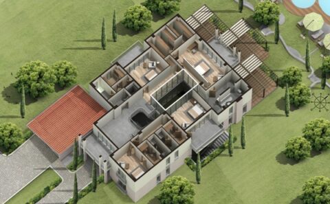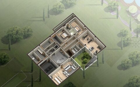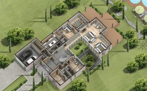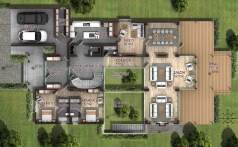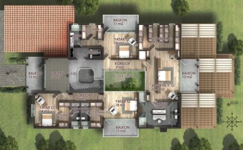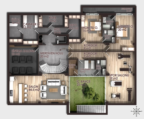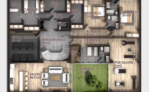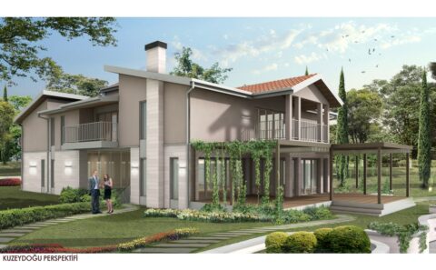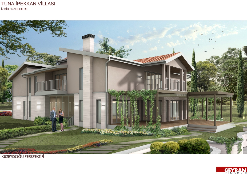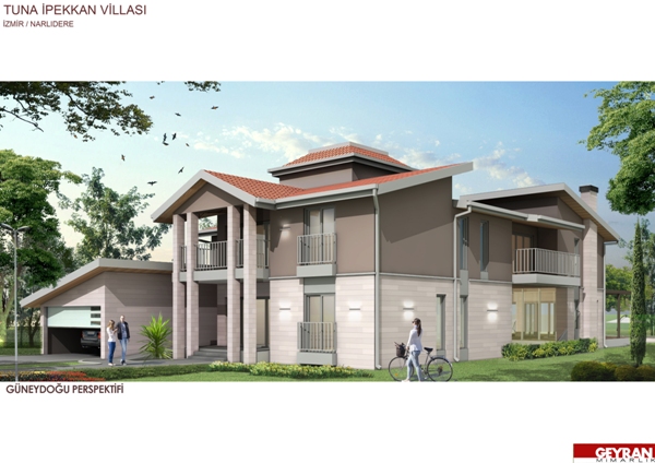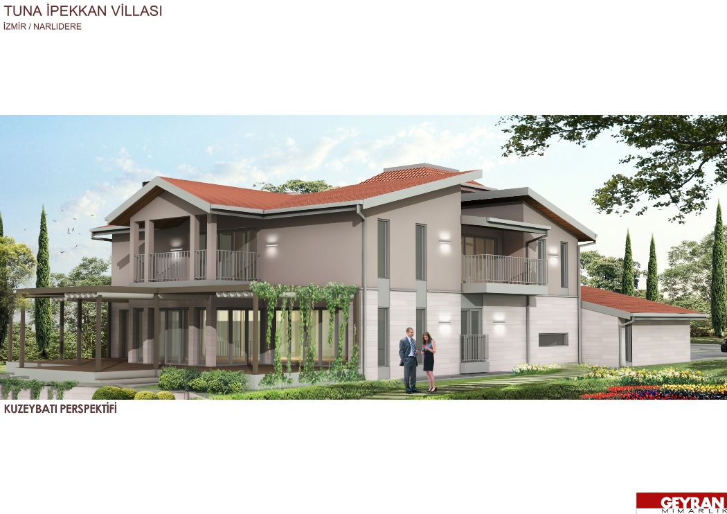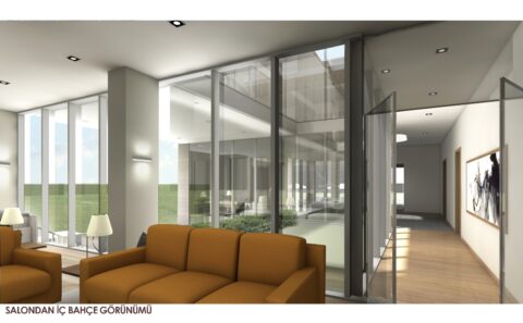 It is a house design for a family of 4 in Narlıdere, İzmir. The house was studied and carried out in order to fulfill the needs, wishes and dreams of the family consisting of parents, a 17-year-old adolescent and a five-year-old child. The building has a closed area of approximately 853m2 including basement, ground floor and 1st floor. Since it is a family has overnight guests , a connecting accommodation suite has been designed from the entrance hall. The guest will be able to come at any time without disturbing the interior parts of the house and use the guest house without opening the interior door. The garage and a small workshop are connected to the entrance hall of the house and the kitchen, so entrance to the house is provided from the garage. The hall with the main staircase is positioned in the gallery that connects the upper floors of the house, and a spacious and bright middle space was created here, receiving light from the truncated pyramid on the roof. The kitchen, family room and dining room are designed in connection with each other. In between the living room and the guest room block, gradual inner gardens were designed in the basement, thus allowing light from the sky from the middle of the house to the basement floors and from the facade. Elevator and laundry shaft were placed in the intermediate hall at the entrance of the kitchen and stair hall, thus facilitating and isolating the in-house service. The hall is placed on the ground floor towards the view. The terrace created in the shape of an inverted “U” is designed to form sheltered corners according to the condition of the north wind. By the upper inner garden built in the center of the building, the hall has been brought to a position to receive light from four direction and a visual connection with the inner garden of the basement floor has been provided. The upper floor is designed as the bedrooms of parents and two boys and the common area where the daytime family will gather. A two-room accommodation opportunity has been created for house keeping stuff on the basement floor. Again on this floor, areas such as sports room, sauna and movie room are designed.