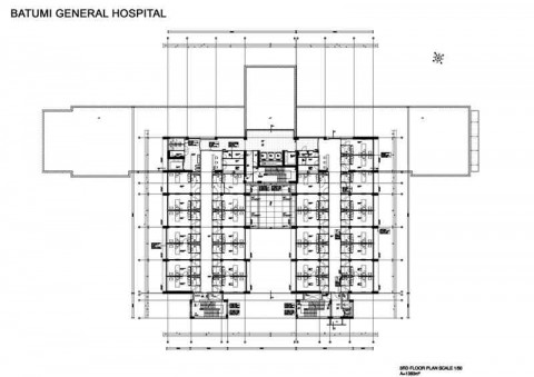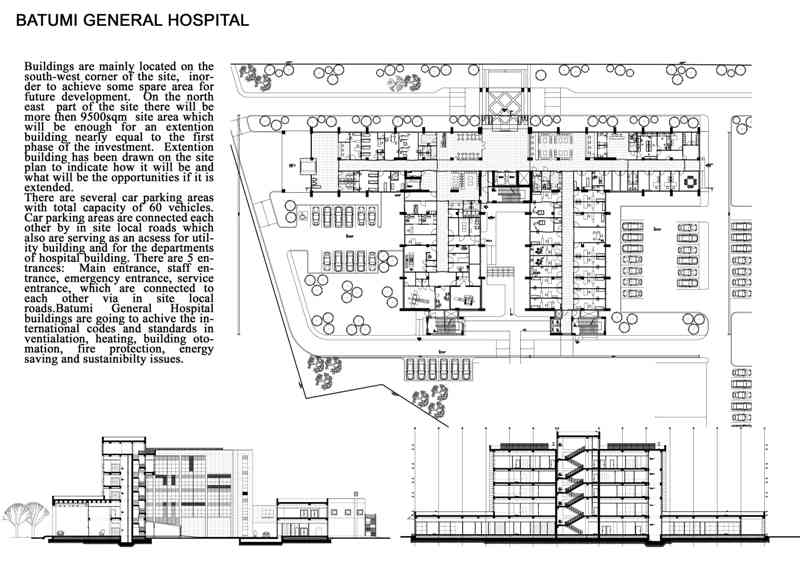 Batumi General Hospital is designed to be constructed in Batumi. The planned overall indoors area of hospital is 6.954 sqm. The overall inpatient bed availability of the hospital is 66 beds. Batumi General Hospital comprises of Radiology, clinical laboratory, angiography, general surgery and Cardio Vascular surgery rooms, internal disease intensive care unit, general surgery intensive care unit, coroner intensive care unit, Cardio Vascular intensive care unit, neonatal intensive care unit, emergency unit, policlinics (cardiology policlinic, Cardio Vascular policlinic, orthopedy and traumatology policlinic, internal diseases policlinic , dentistry policlinics, urology policlinic, neurology policlinic, gynecology policlinics, IVF (in vitro fertilization) center, delivery rooms,  3 inpatient services with 15 bed availability,  cafeteria,  laundry, administrative units, central sterilization unit lot sections.