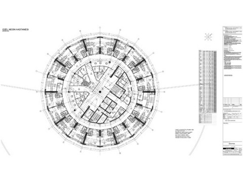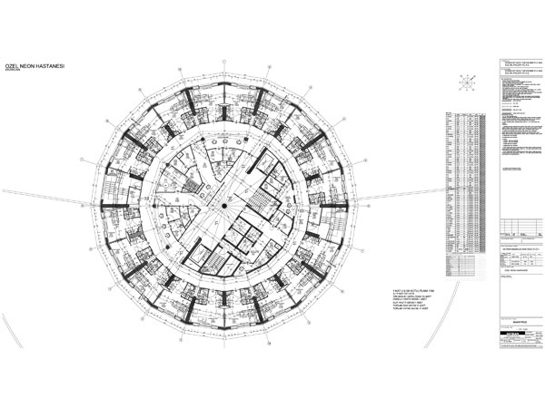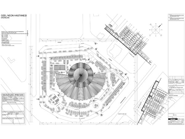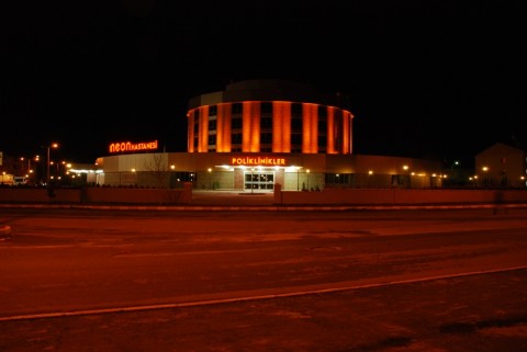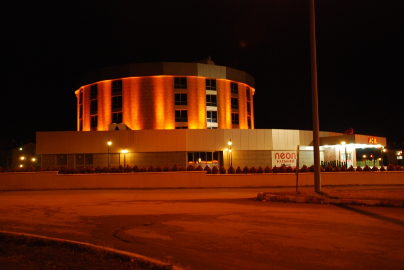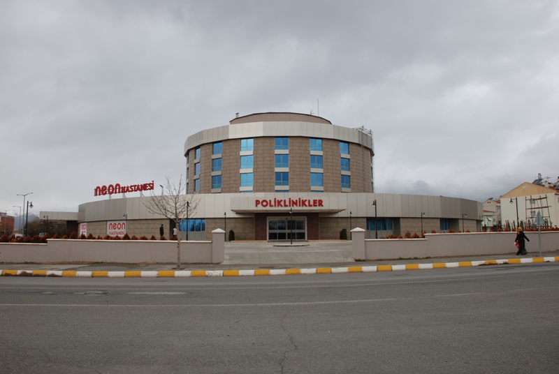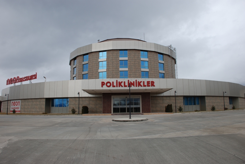 Neon Hospital is located in District of Erzincan. The hospital has an indoors area of 10.000 m². The Private Neon Hospital is established by procurement of a hotel constructed by Erzincan Municipality by the partners of a large shopping mall located within the city and transformation of the hotel into a hospital building. The hotel building is constructed on flat layout basis. As is the case for numerous examples throughout the world, the floors are associated with a large gallery space and a high ceiling monolithic space was designed in the form of floors. In the course of transforming this building into a hospital building, the hotel rooms are enlarged to suitable dimensions and the atrium at the center is closed at each floor and nurse stations and servicing units are designed at this central locality. By virtue of such design, the patients resting in their patient rooms are allocated out of the general traffic of the hospital, thus creating a quieter and manageable inpatient room floor with specific boundaries. The stretcher elevators, servicing lifts and additional staircases as required during transformation of the building into a hospital are constructed within the closed gallery space in compliance with the measures and specifications. The additional space to the inpatient floors generated by closing the gallery space are resolved by means of steel constructions, thus steel construction floors are formed without intervening to the main structure formed by reinforced concrete carcass. Private Neon Hospital has overall inpatient bed availability for 74 patients. The hospital comprises of radiology, clinical laboratory, pathology laboratory, physical therapy and rehabilitation center, policlinics, emergency unit, 4 inpatient services with 17 bed availability, surgery rooms, internal and surgery intensive care, coroner intensive care, neonatal intensive care, delivery room, central sterilization, administrative units, cafeteria and mess hall sections. The surgery room, intensive care units, central sterilization unit, etc. of the health care facility are designed as a completely new annex building located at the 1st basement floor. Both the hallway widths and the floor heights are formed to the required dimensions without being affected from the existing situation. For the land characterized as map section surrounded by roads in 4 directions, the main entrance is organized in north direction, the policlinic entrance is organized at east direction and the emergency unit entrance is organized at the south direction and such entrance areas are interconnected by means of internal roads formed within the building plot. Following entrance to the building from northeast direction, a ramp leads to basement floor servicing court. The medical gas, morgue, storage areas and the servicing areas located at this basement receive services by virtue of this courtyard. In this manner, the inpatient and outpatient traffics are resolved at different altitudes, avoiding their interception. A single-story podium building is formed at the ground floor and the policlinic areas are resolved within this floor. In this manner, the crowd at the vertical circulation tools as generated by outpatients by ascending to upper floors of the buildings is avoided. The side coatings are elaborated as mechanically installed porcelain tiles while the window areas are elaborated as tempered and laminated glazing aluminum curtain wall. Thermal and water isolation layers are formed behind the curtain wall.