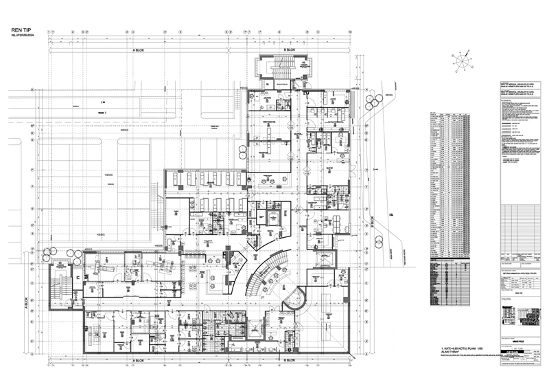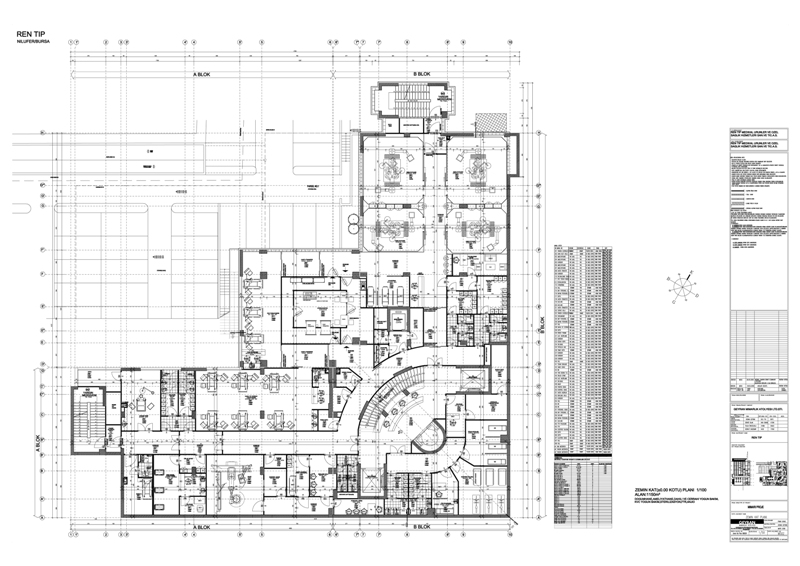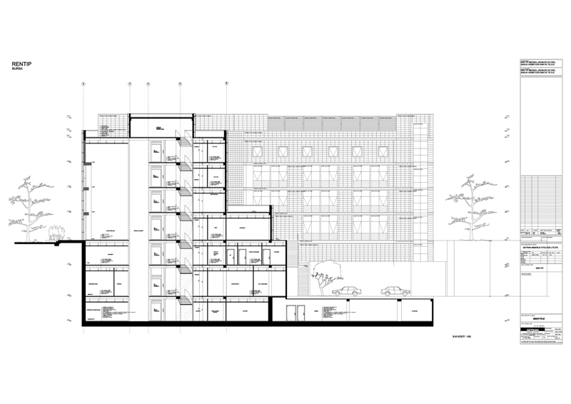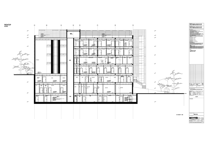 Rentıp Hospital is located at Nilüfer District of Bursa. The hospital has overall indoors area of 10.000 m² and designed to have “L” shaped layout plan in accordance with the site data over an inclined building plot. The private hospital with inpatient bed availability of 64 patients and 40 patient rooms comprise of Radiology, nuclear medicine, clinical laboratory and pathology laboratory, physical therapy and rehabilitation unit, policlinics, emergency unit, 4 inpatient services with 10 bed availability, KVC surgery room, surgical procedure rooms, internal diseases intensive care, surgical intensive care, delivery room, angiography, central sterilization unit, administrative buildings, cafeteria, mess hall, seminar hall and indoors parking lot sections. Both wings of the L layout plan contain two different inpatient services. A high ceiling atrium connects both wings to each other in vertical and horizontal directions. The atrium is designed to receive natural sunlight from east direction. The nurse station of the inpatient services are associated with each other by means of respective private study spaces and hallways interconnecting such spaces and the servicing units that might be required by both counters are designed to be used collectively. A separate servicing elevator serving to these sections is considered to ensure vertical connection. The main entrance of the building (the hospital entrance) is planned to be from the eastern direction directly from the corner at the intersection point of two roads. There is a difference of levels between the ground level at this locality and the ground locality at the opposing western section that exceeds two floors in total. The outdoors parking lots are organized at the western section of the building plot by means of suitable terraces and connection ramps by altering the natural soil conditions at minimal levels. The cafeteria of the hospital is located between two wings of the “L” shaped building at the opposite direction of the hospital entrance at the western facade. An economical solution was applied as the side coating in accordance with the requests of the investor and the facade of the atrium block forming the entrance section of the hospital is designed with curtain wall formed by mechanically installed tile porcelain and tempered and laminated glazing. The building wings of the atrium block extending in northern and southern directions are designed to have siding and acrylic paint over the thermal insulation. The architectural project, electrical project, static project and the mechanical projects of the private hospital are completed in 2008. The construction activities for the private health care institution started in 2008 and currently in progress.