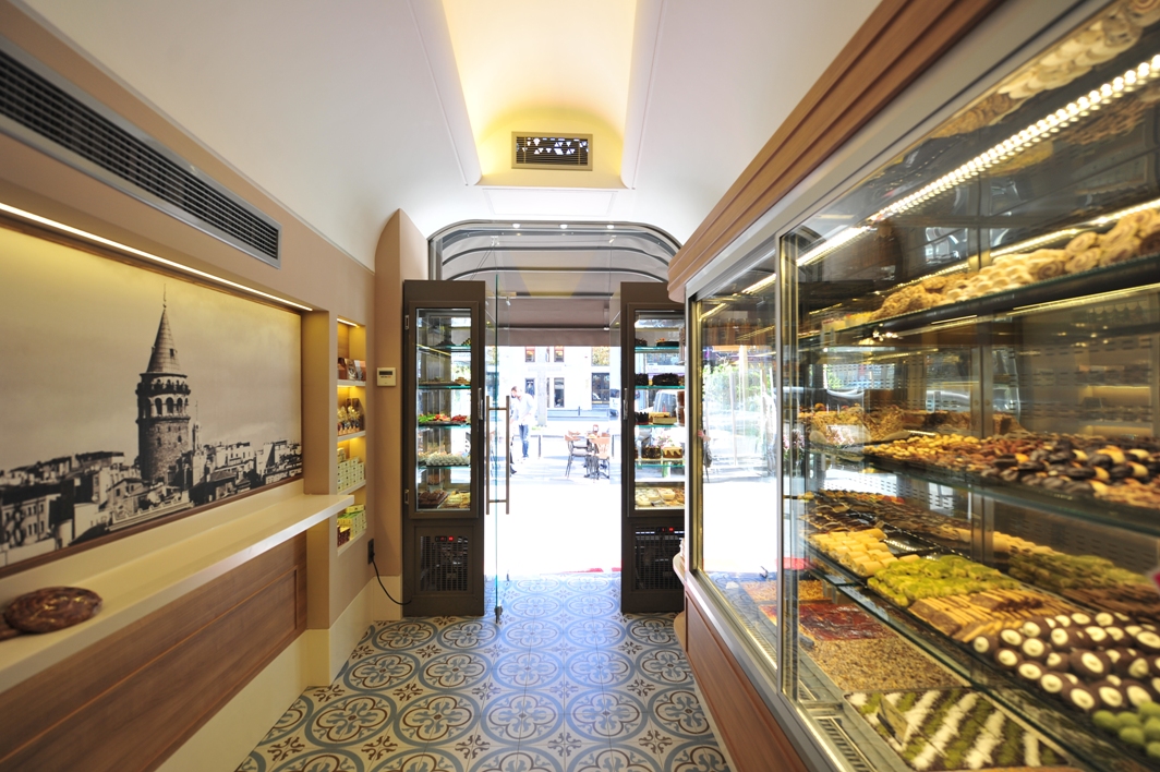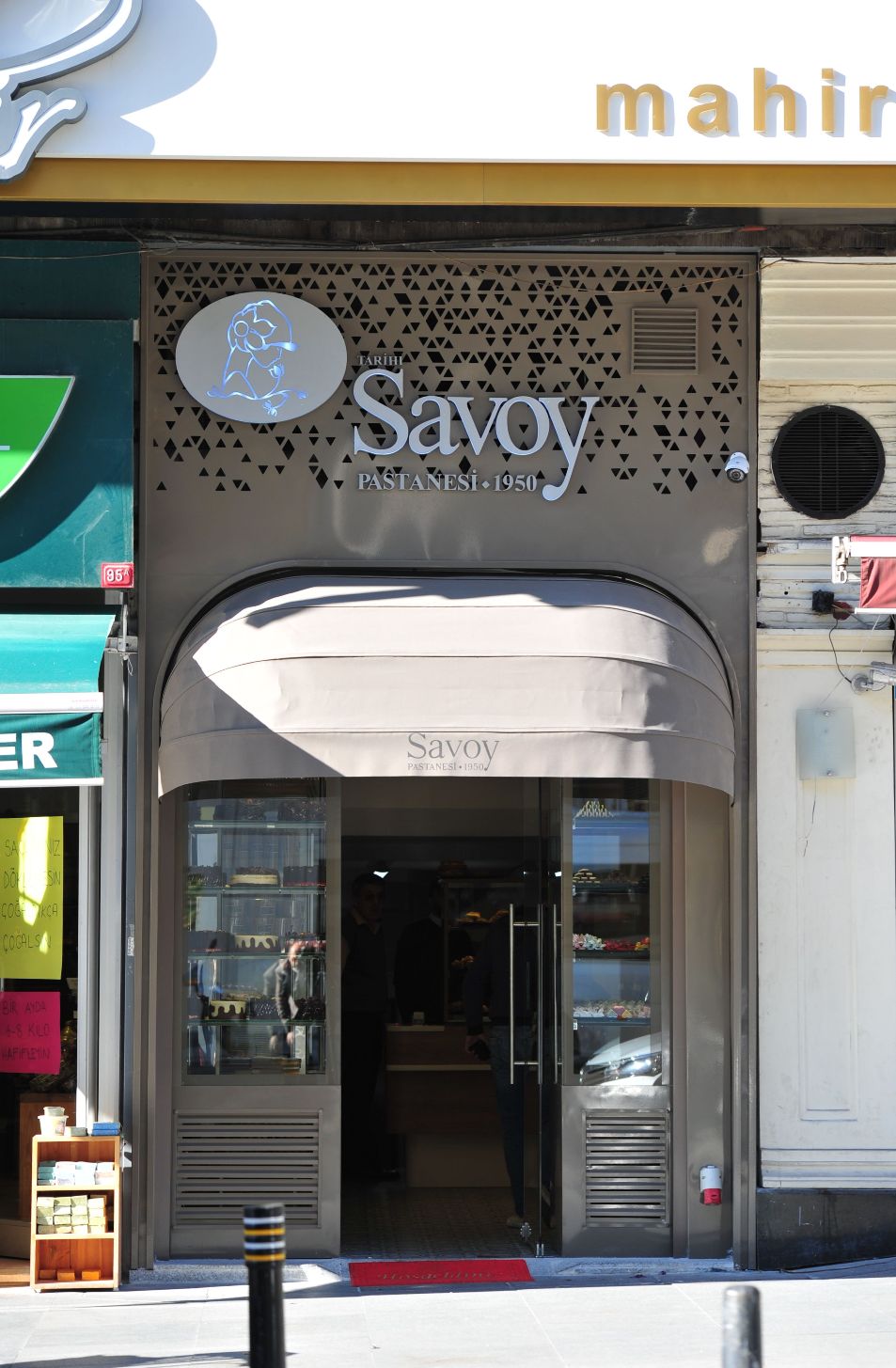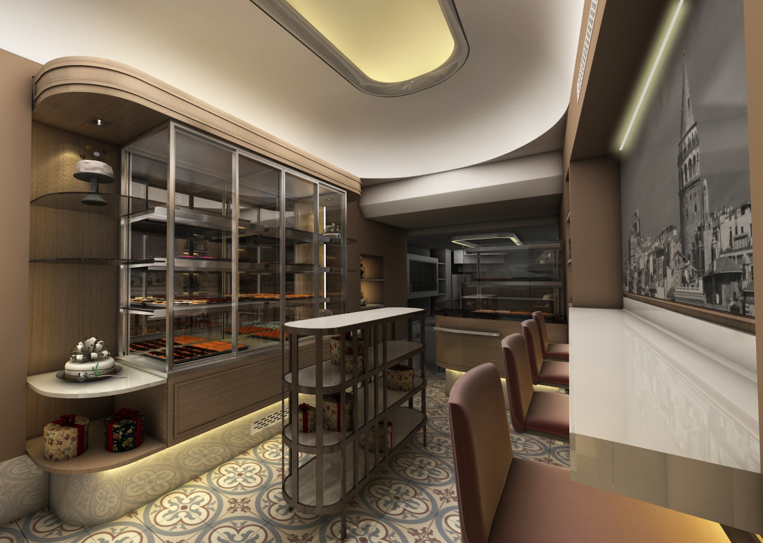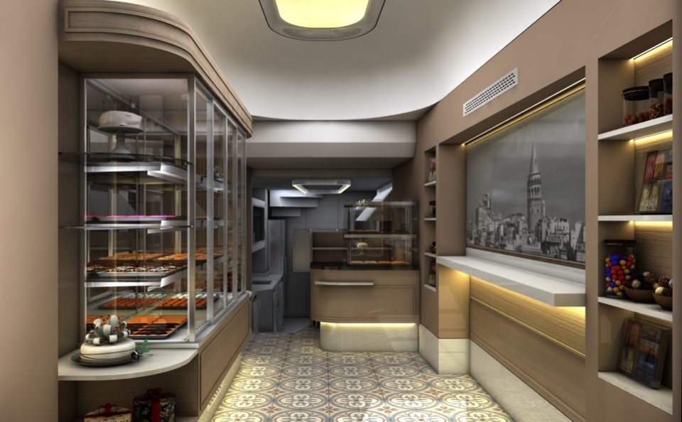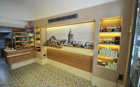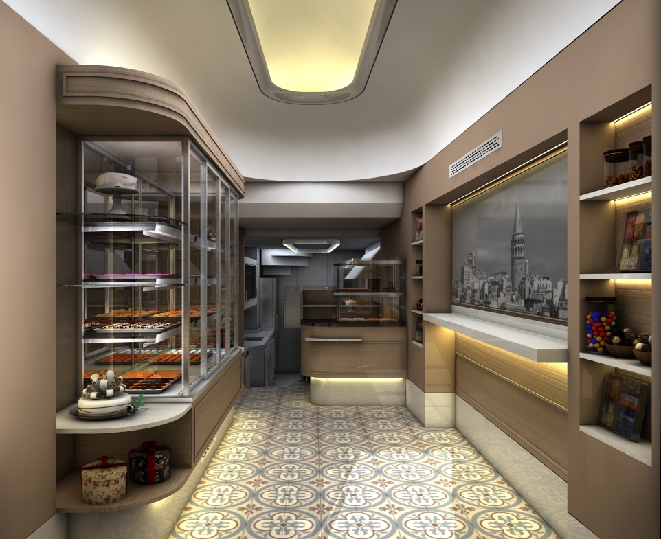 Some alcoves are placed on the walls and several shelfs attached into. Two show cases has been designed to expose delights on both sides of the facede. This show cases refregarated and they act part of facade. Entrance exist in between these show cases. Beyond entrance on the left hand side there is a refregerated show case full of colourful cake and pastry on the opposite side there is a acrylic stand amongst the alcove where people can eat some delights on foot. Upper side of this stand Galata Tower reproduction 245cm x 85cm in dimensions with Savoy logo has been attached. Both left and right hand side of this stand there are two alcoves with shelves to expose some packed chocolates. On the counter side of the main entrance there are shelves for warmish pastry and cookies. Behind of this shelves there is small space with drawers and cabinet to serve as cash register for counter man.