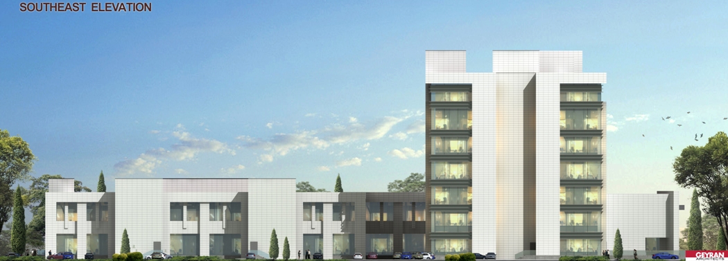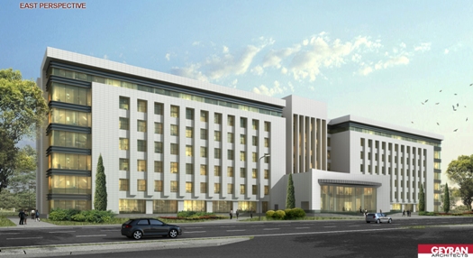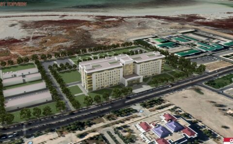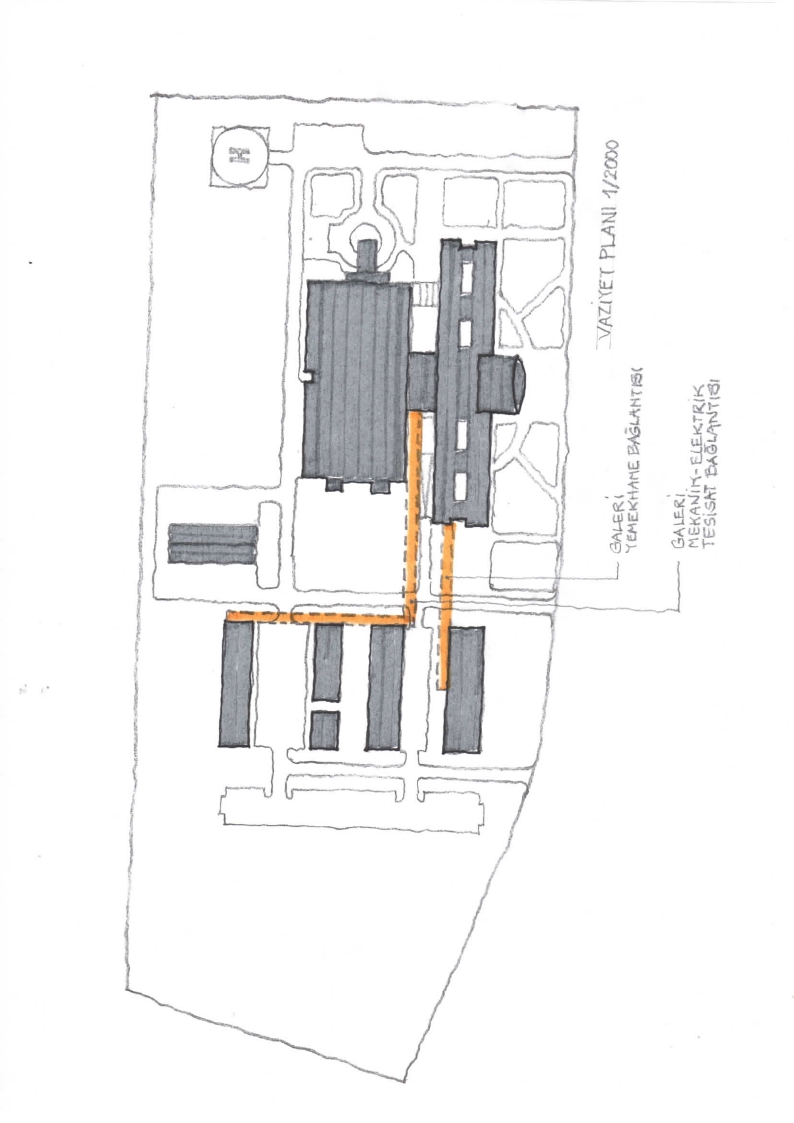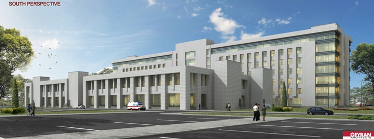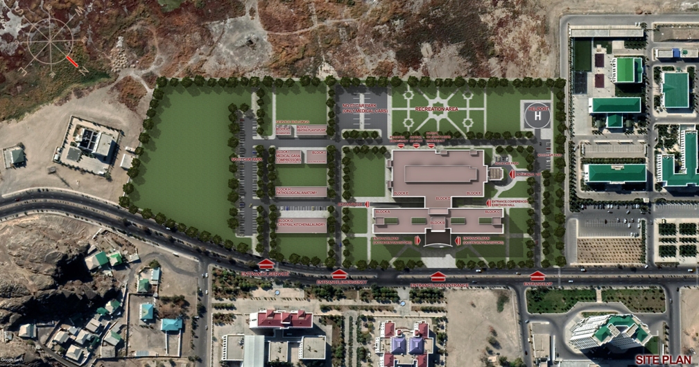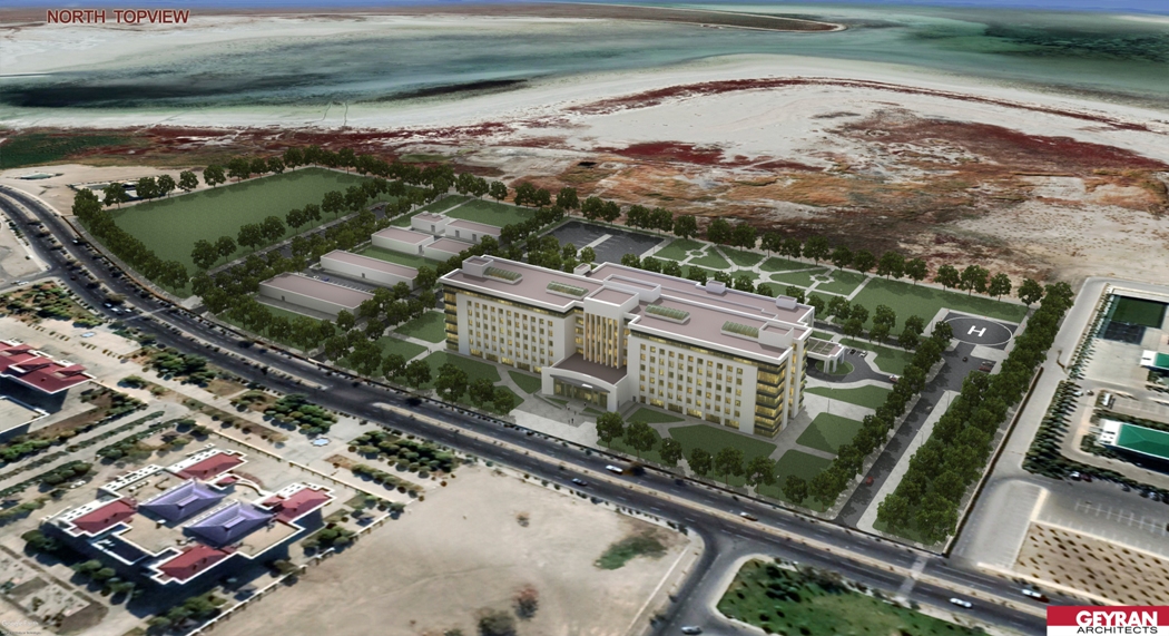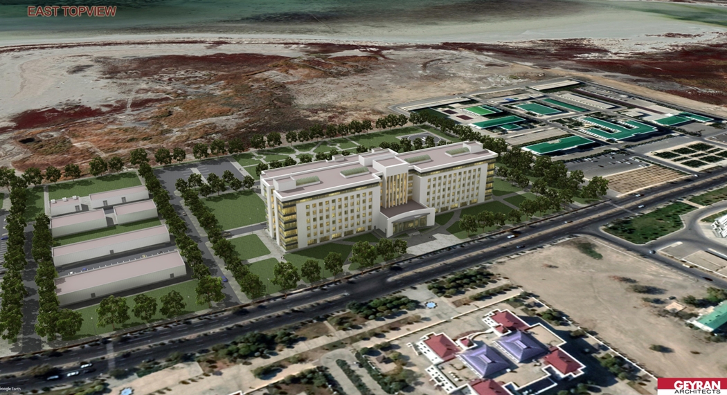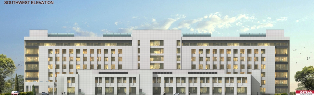 The Köpürgülü hospital was designed to be built in Turkmenbashi city of Turkmenistan. The site is located to the east of the Caspian sea. The facility consists of 2 hospital and 5 supporting blocks. One of the hospital block which has patient wards is located to the north of the site. This hospital block has 1 basement and 7 regular storeys. The blok dimension is 150mX30m. Wards has double corridor with patient rooms in both sides. There are examination rooms in the ground floor. The other hospital block has two-storeys with 100mX55m dimension is located on the South of main hospital building. Operating rooms, intensive care units, delivery rooms, radiology, central sterilization units etc. are located in this building. The VIP patient department as well is located in this block. A separate entrance is designed for the VIP department. There is a separate parking lot and canopy for the important people who arrives here. The helipad is very near to the VIP entrance. While the VIP department uses the medical areas in common, VIP patient ward is separate. From VIP to the medical areas there is dedicated connection. Outpatient and visitors circulation doesn’t intersect the circulation of patient on stretcher and medical staff. VIP patient entrance is on the west side of the facility and has its own car park. Hospital’s main entrance is on the north facade facing the road. Ramps are available for patients with disabilities. The entrance of the emergency unit is in the south. Patient entry on stretcher and patient on footh entry are arranged separately for emergency patients. There are floors for installation at many points. These are for heating, cooling and ventilation of buildings. The boiler room is located in a separate building east of the site away from the hospital blocks. Water tank, plumbing, medical gas and oxygen generator is also located in a separate building on the east of the site. The medical waste incinerator is also located near by. The flue gas is positioned so as not to reach the hospital according to the prevailing wind. Electric units, generators, transformers and main distribution panels are designed in a separate building and placed in the south of the site. Chiller groups are located at the furthest point to the hospital building. In this way, the noise to the hospital is prevented. The connection of the plumbing buildings to the hospital blocks is provided with underground galleries measuring of 6.00mX2.50m. It is designed to allow people to enter these galleries. In this way, maintenance, repair and control operations can be made. The galleries can be reached by the stairs leading down to the basements. The dining hall and central kitchen are designed in a separate building for patients and staff. In this kitchen, diet cuisine is considered for patients. There is a terrace in front of the dining hall which is designed for rendering service to the staff. The meal reaches to the hospital building through the connection gallery in the basement. There are meal distribution kitchenettes in patient wards. In this way, suitable food service can be provided for each patient room. The laundry is in the same building as the central kitchen and reaches the hospital building using the same connection. Pathology and morgue departments are designed in a separate single storey building to the east of the site. Separate covered parking building for ambulance and medical personnel vehicles are located to the south of the plot. In this way, these vehicles are intended to be ready for service through out the year. The helipad and connecting roads for the ambulance helicopter are designed in the south east of the site. The health establishment has 400 patient beds, 42 intensive care beds, 25 examination rooms, 10 dentistry clinic, 12 operating rooms, 6 LDR rooms, dialysis unit, chemotherapy unit.